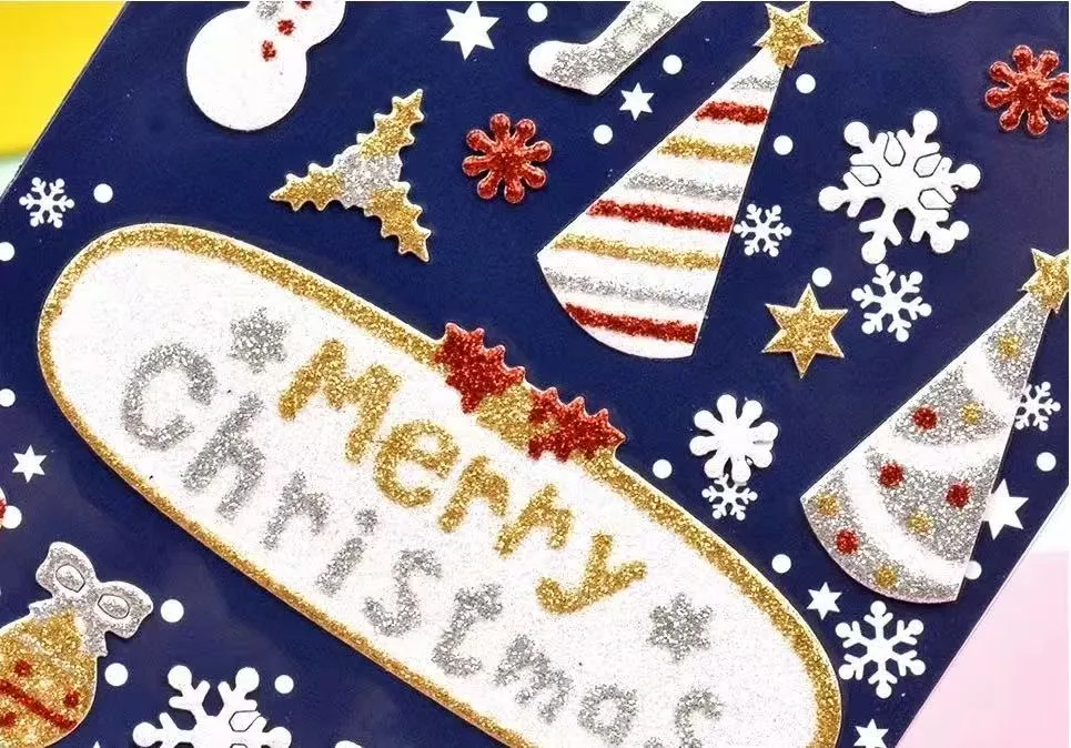 Die Weihnachts -Glitzer -Aufkleber können eine hervorragende Haftung an verschiedenen glatten Oberflächen wie Kunststoff, Glas, Metall und Papier erzielen.