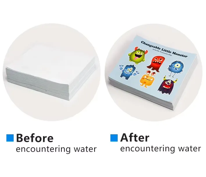 Beim Eintauchen in Wasser geht es sofort in einen pastösen Zustand über und verteilt sich schnell. Die darauf gedruckten Farben breiten sich dann aus und verformen sich entsprechend. Der Farbänderungsprozess ist irreversibel. Sobald es Wasser ausgesetzt wird, zeigt es dauerhaft die Farbe an.