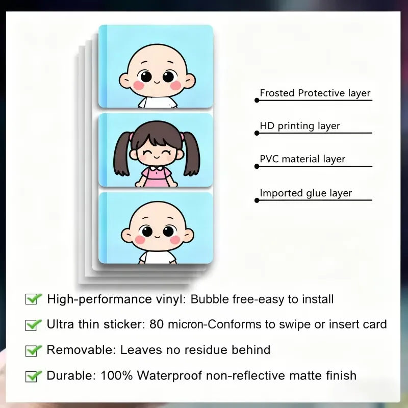 Kreditkartenhüllen bestehen üblicherweise aus Materialien wie PVC-Kunststoff, der dünn ist, leicht anzubringen und zu entfernen ist und oft über eine wasserfeste und kratzfeste matte Oberfläche verfügt, um Haltbarkeit und ein langanhaltendes Aussehen zu gewährleisten. Sie sind wasserdicht, reißfest und kompatibel mit hochauflösendem UV-Druck.