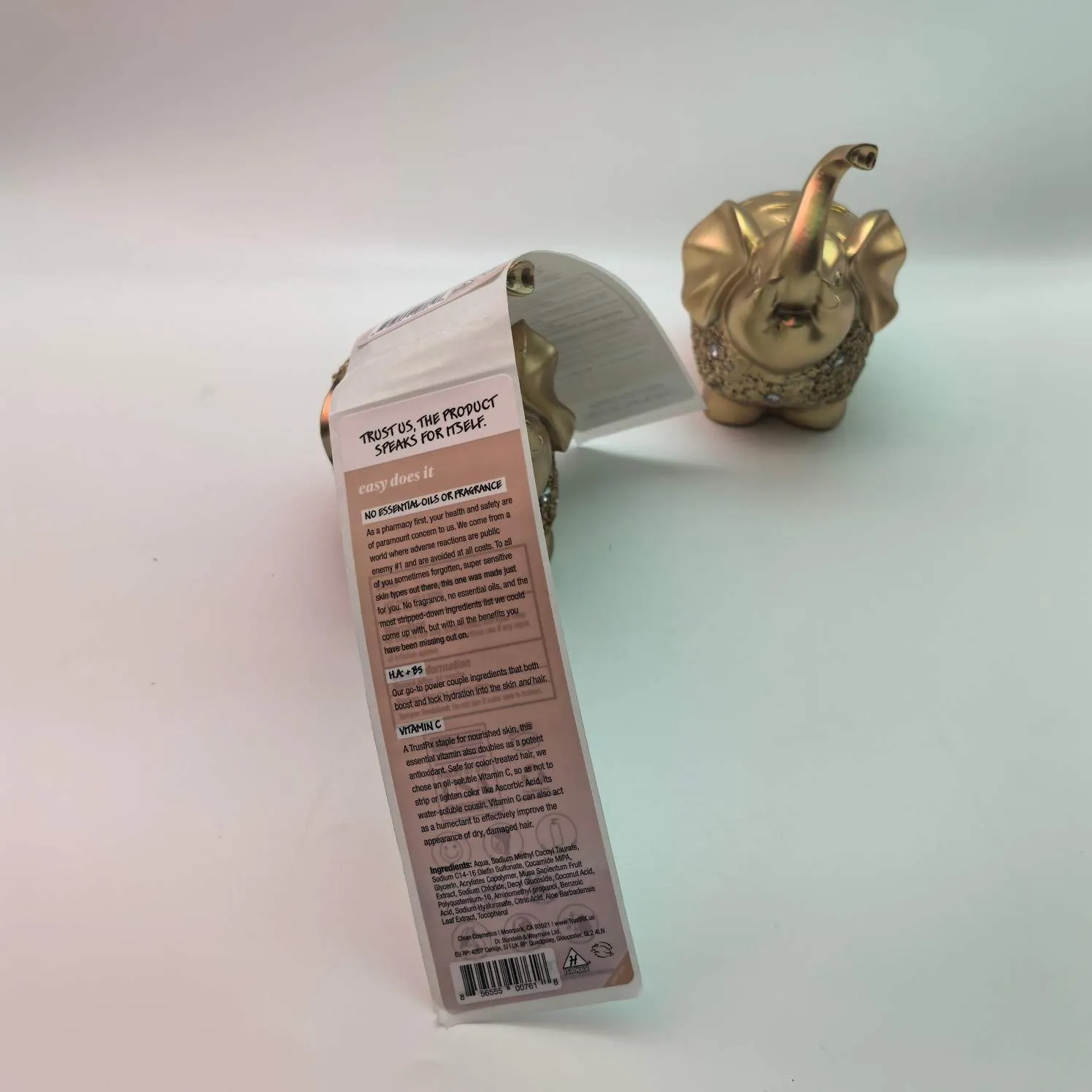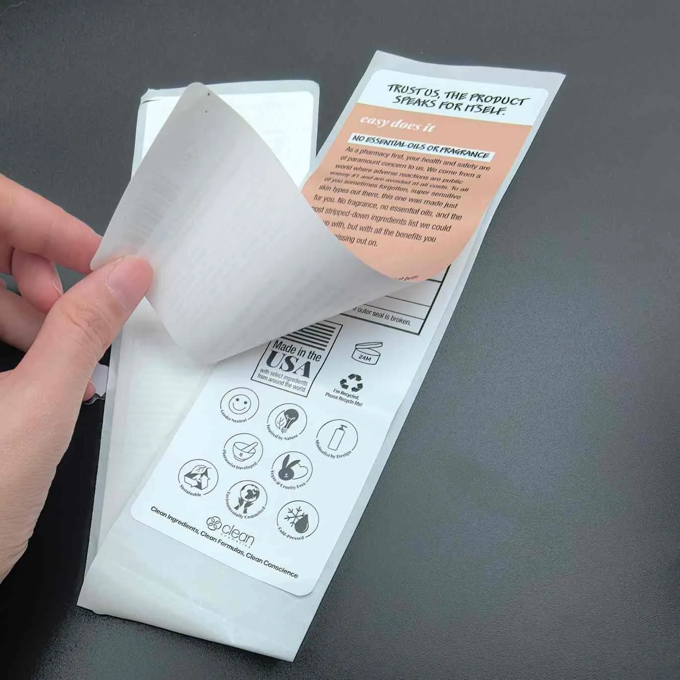 Etiketten abziehen und lesen:Der einfachste Typ wird für Kosmetiketiketten auch MultiLayer genannt. Die obere Schicht lässt sich leicht abziehen und die innere Schicht enthält erweiterte Informationen. Es wird häufig für Gesichtsmasken, Seren und andere kleinverpackte Produkte verwendet.