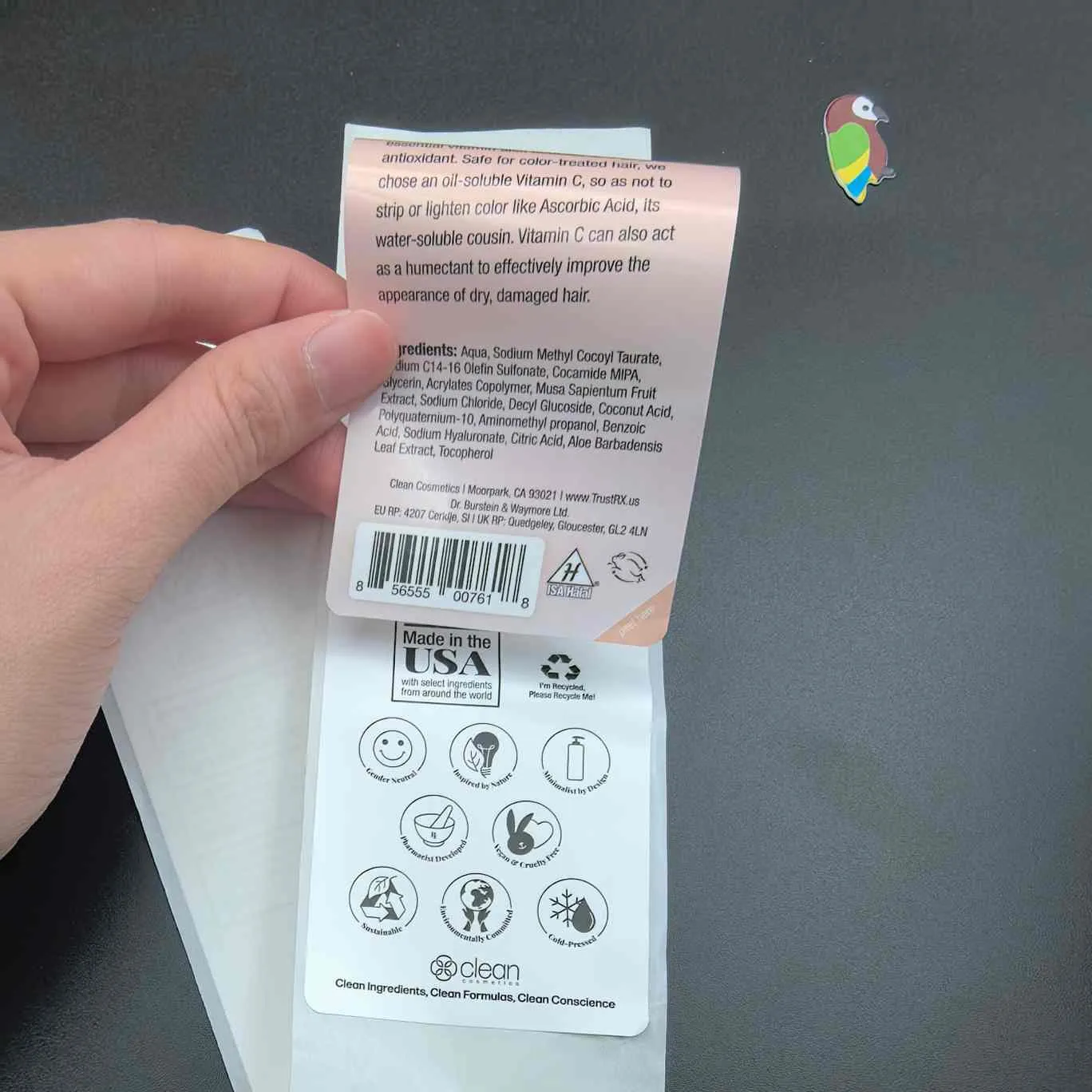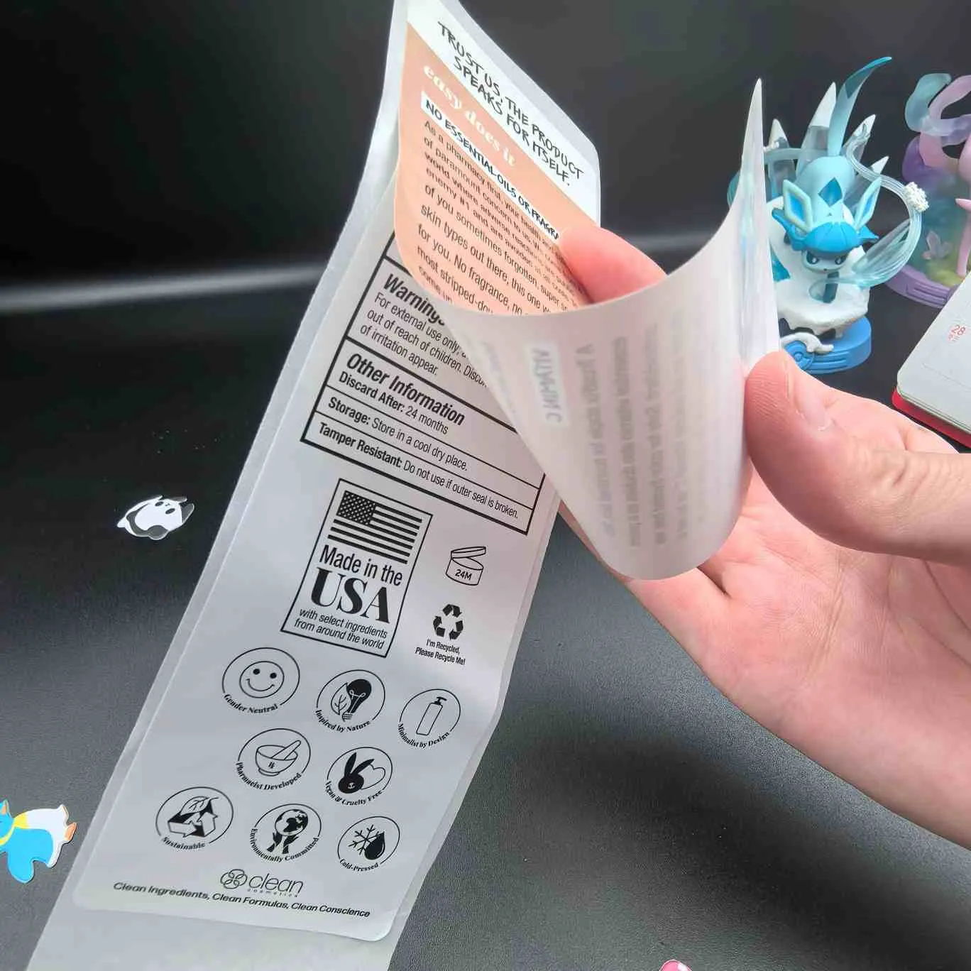 MultiLayer für Kosmetiketiketten, auch bekannt als mehrschichtige Kosmetiketiketten, bezieht sich auf ein spezielles Etikettendesign, das in der Kosmetikindustrie weit verbreitet ist. Es besteht aus zwei oder mehr Lagen Etikettenmaterial, die miteinander verbunden sind. Im Gegensatz zu herkömmlichen einschichtigen Etiketten können Benutzer die obere Schicht abziehen, um zusätzliche, auf der inneren Schicht aufgedruckte Informationen freizulegen.