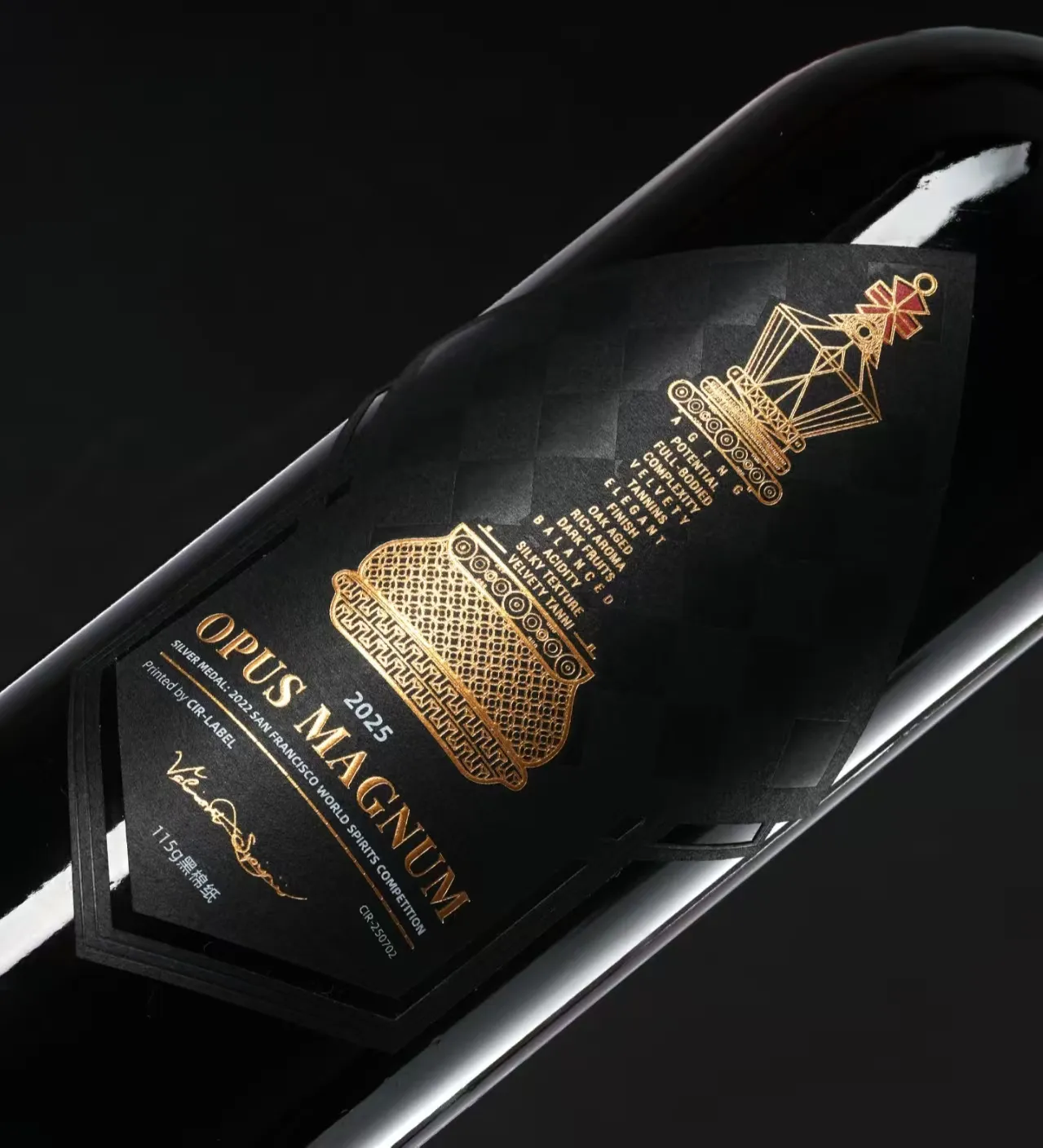 DasWeinetikettverfügt über eine umfangreiche Goldfolienprägung. Der schwarze Hintergrund wird mit goldenen Linienmustern kombiniert, während der Text eine Kombination aus Gold und Weiß verwendet. Die Helligkeit des Goldes und der Glanz der Folienprägung sorgen zusammen mit den leicht erhabenen Mustern und Texten für Akzente und klare Schichten und sorgen für eine klassische und elegante Ästhetik.
