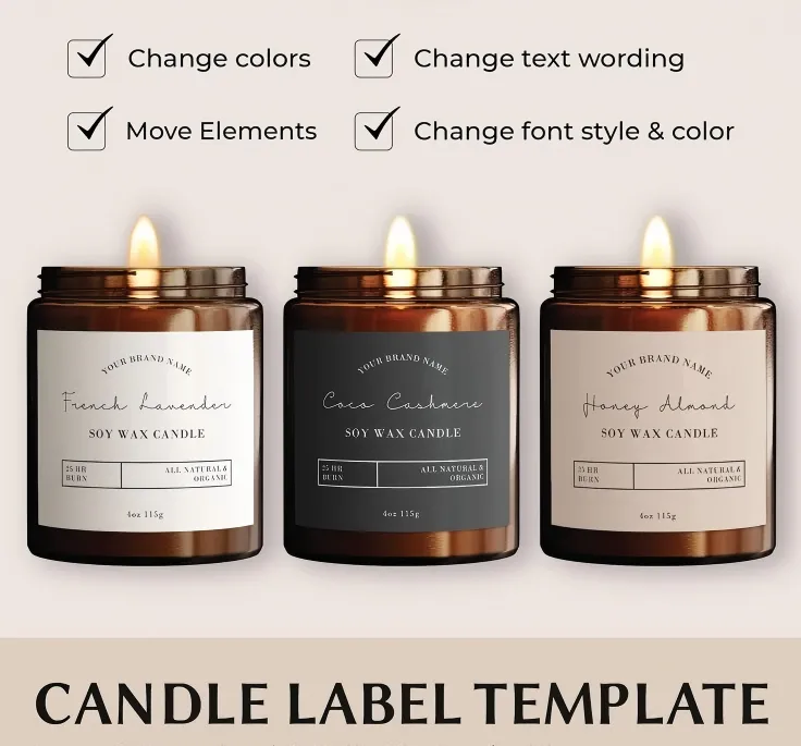 Aluminium:Bietet hervorragende Haltbarkeit und einen eleganten, metallischen Look. Es ist wasserdicht und hitzebeständig und eignet sich daher für Kerzen in Umgebungen mit hohen Temperaturen. Die reflektierende Oberfläche des Materials erhöht die Sichtbarkeit der Marke, ist jedoch möglicherweise schwerer als andere Optionen.