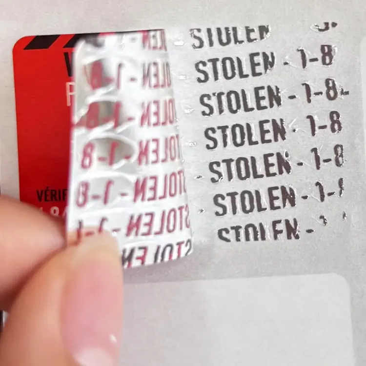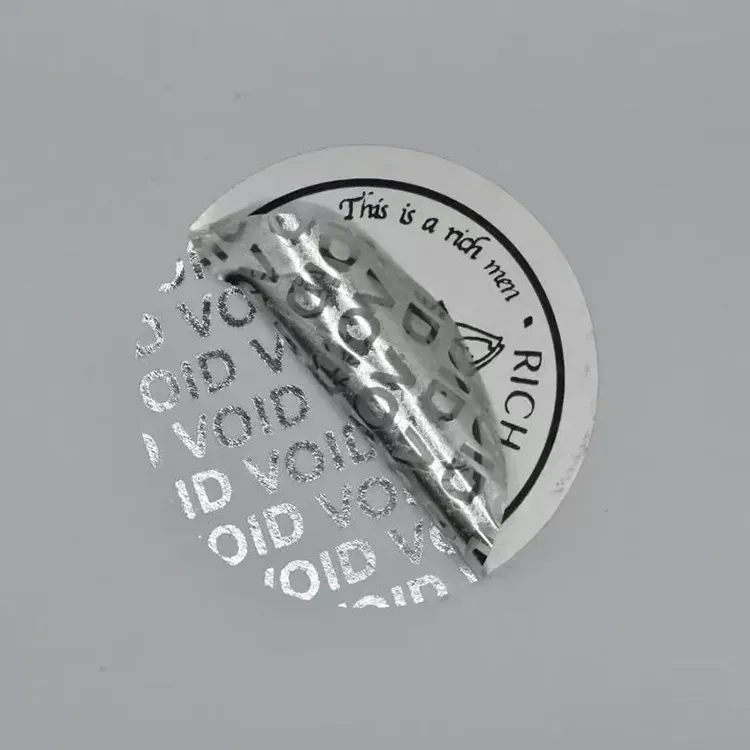Die void Antikounterfiting-Etikett besteht aus einer Oberflächenschicht, einer mittleren Klebstoffschicht und einer Basisschicht. Die Oberflächenschicht besteht aus kratzfestem und weastbeständigem Material und kann mit dem Firmenlogo und anderen Inhalten gemäß den Kundenanforderungen gedruckt werden. Die mittlere Klebstoffschicht ist ein spezieller Klebstoff, der, wenn das Etikett abgezogen wird, ein Teil der Kleberschicht auf der Oberfläche des angehängten Objekts bleibt und das "Hohlraum" -Muster oder -Text enthüllt. Die Basisschicht schützt die Kleberschicht und kann vor der Kennzeichnung leicht abgezogen werden. Das Etikett kann bestimmten Temperatur- und Feuchtigkeitsänderungen und täglichen Reibung standhalten, um sicherzustellen, dass der Anti-Counterfiting-Effekt nicht durch normale Verwendung ausgelöst wird.