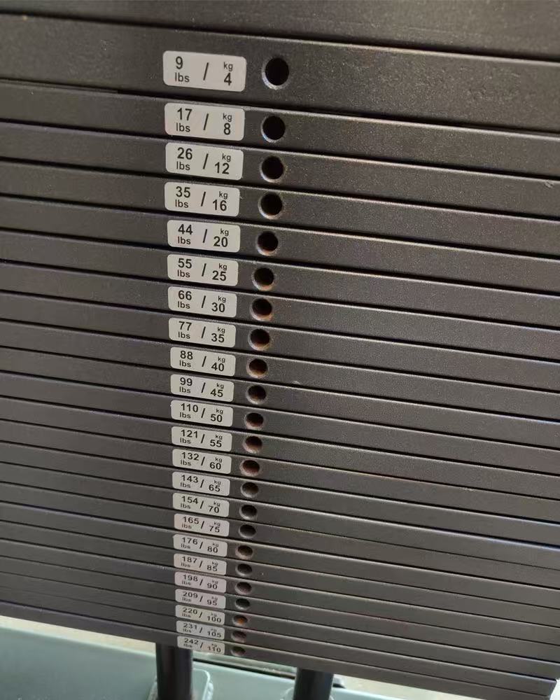 Jeder Aufkleber ist deutlich mit Gewichtswerten gekennzeichnet, sodass Benutzer die für ihre Trainingsintensität geeigneten Gewichtsblöcke schnell identifizieren und auswählen und häufiges Wiegen während des Trainings vermeiden können.